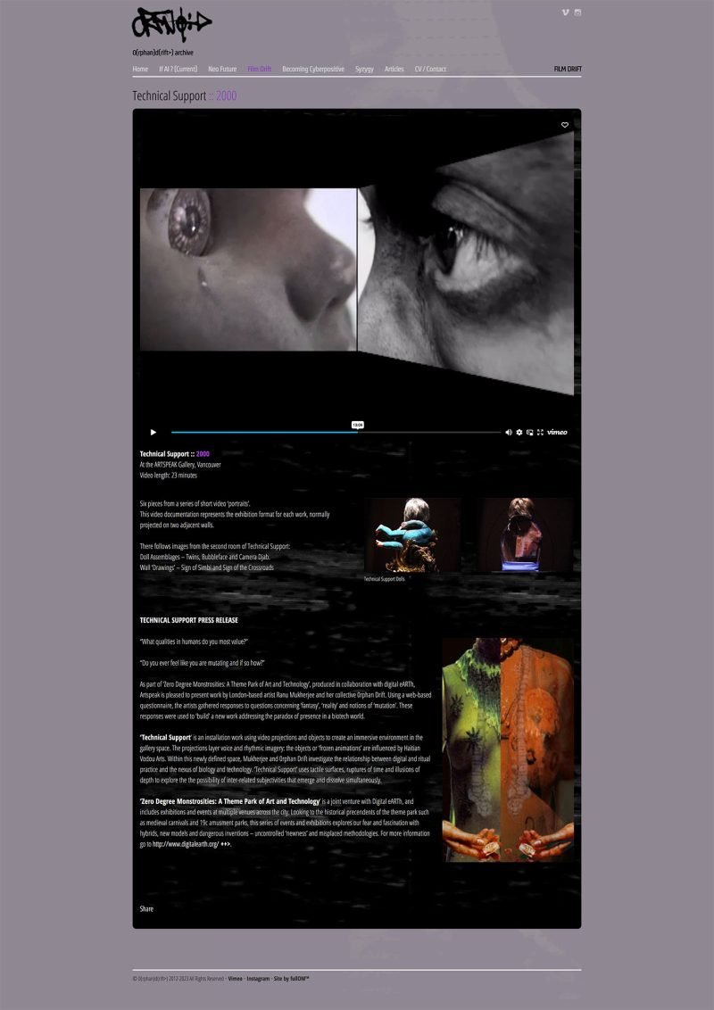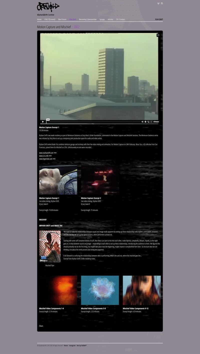 Online archive for the collaborative artist collective 0(rphan) d(rift>), predominantly made up of visual artists, but also involving sound designers, concept engineers and media activists.