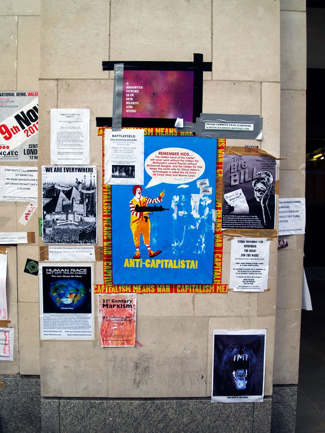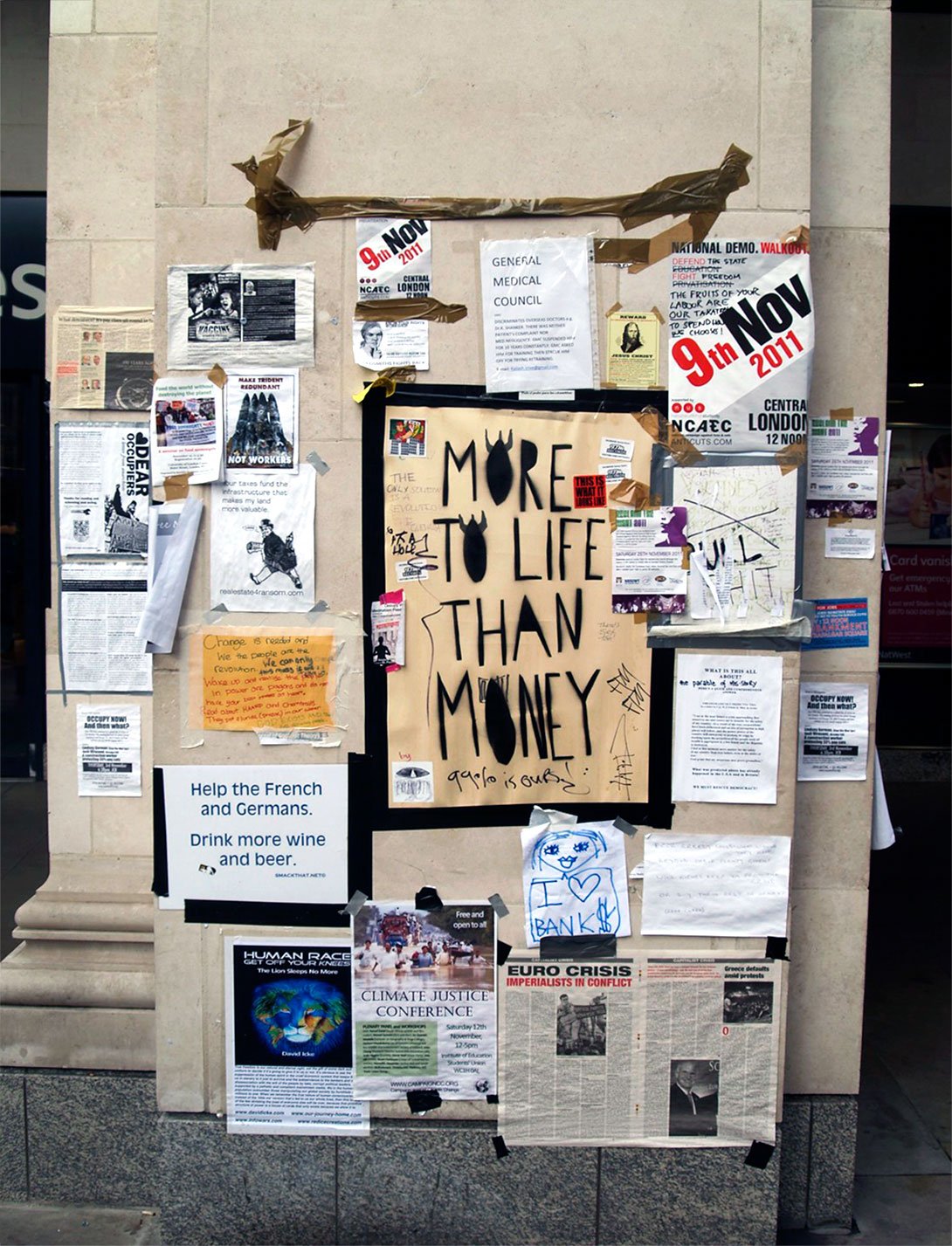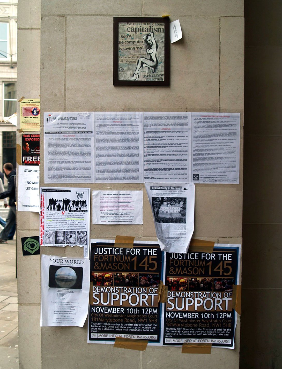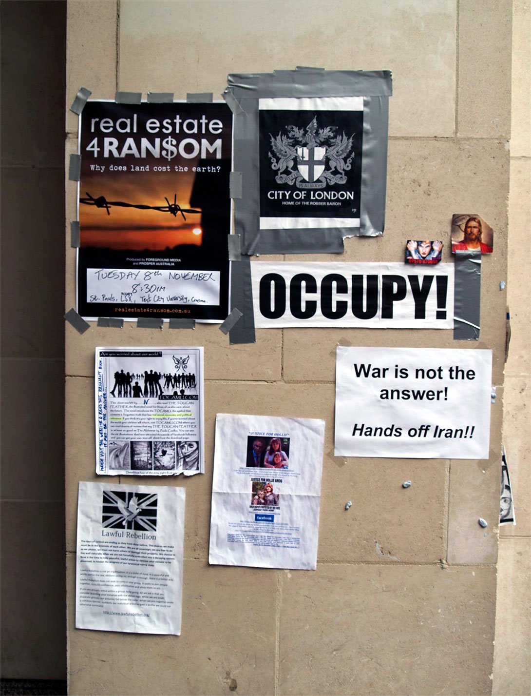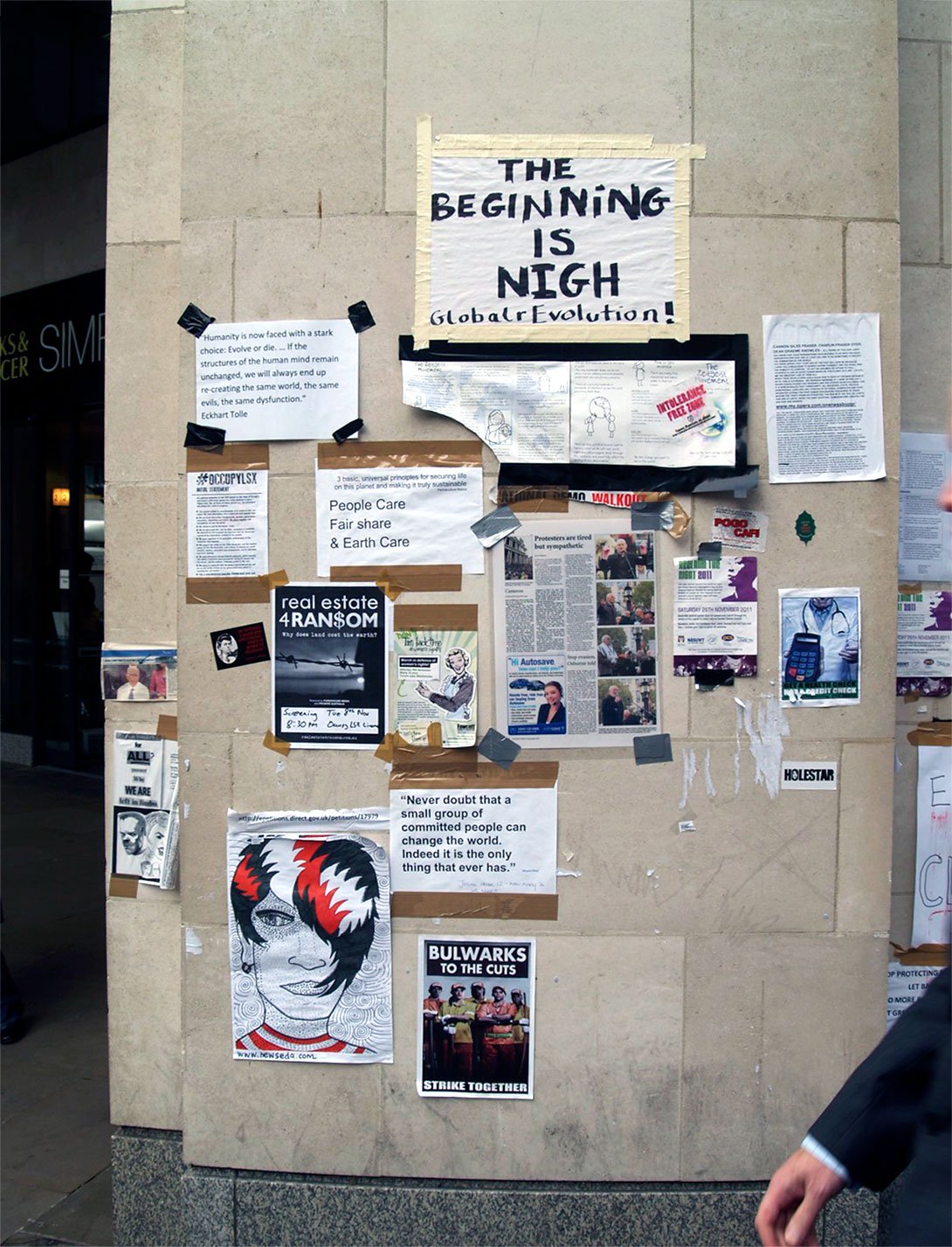 “Protesters from the group Occupy have gathered outside St Paul’s Cathedral and City Hall to mark one year since they first set up camp in London’s financial district. The group – part of a worldwide movement against corporate greed – set up outside the cathedral on 15 October last year to ‘initiate global change’. They were evicted after four months.”